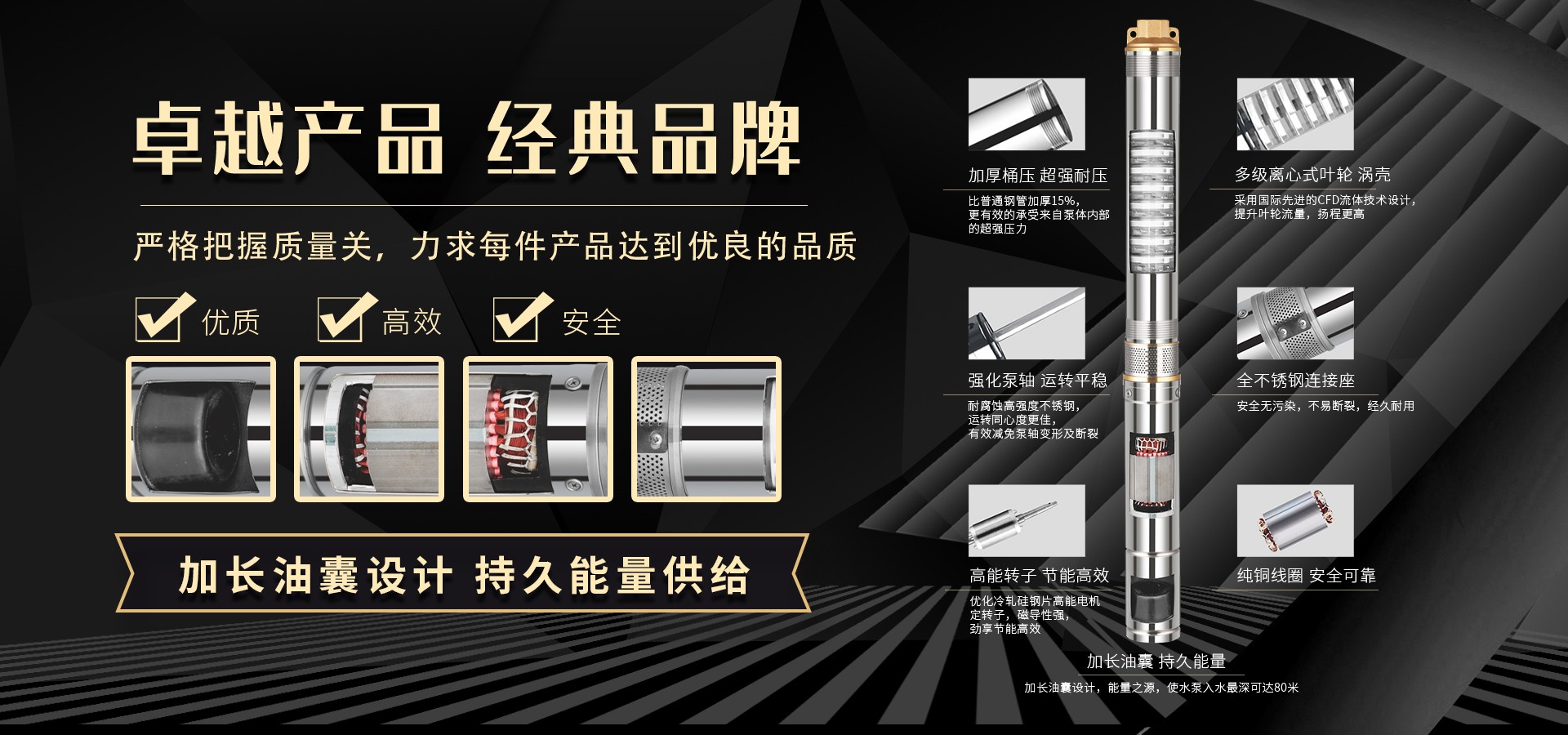 不僅僅是泵,更是流動(dòng)的科技。十多年來,本公司堅(jiān)持走:以質(zhì)量求生存以科技創(chuàng)新求發(fā)展,重合同守信用的道路,生產(chǎn)經(jīng)營(yíng)得到迅速發(fā)展。更希望以后不管從發(fā)達(dá)城市到新農(nóng)村,從工業(yè)制造到尖端科技產(chǎn)業(yè)都隨處可見創(chuàng)江井泵的身影,創(chuàng)江深井泵已成為干萬用戶心目中優(yōu)質(zhì)和信心的保證我們將以優(yōu)質(zhì)的產(chǎn)品和最完善的售后服務(wù)來真誠(chéng)與各界朋友開展廣泛的合作,共同創(chuàng)造一個(gè)美好的未來!